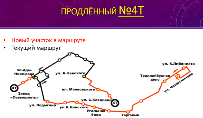 В маршруте автобуса №4т добавили следующие остановки: «Севморпуть», улицы Маяковского и Ковалева, а также улицы Лодыгина, Невского, Угольная база, Торговый порт, троллейбусное депо, Карла Либкнехта и Челюскинцев.