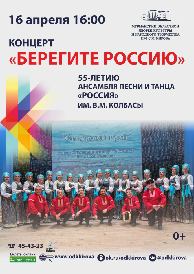 На сцене Мурманского областного Дворца культуры и народного творчества имени Кирова 16 апреля состоится концерт заслуженного коллектива народного творчества ансамбля песни и танца «Россия» имени Владимира Колбасы.