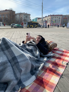 Мурманчанин решил отдохнуть прямо на главной площади города. Молодой человек обустроил импровизирован…