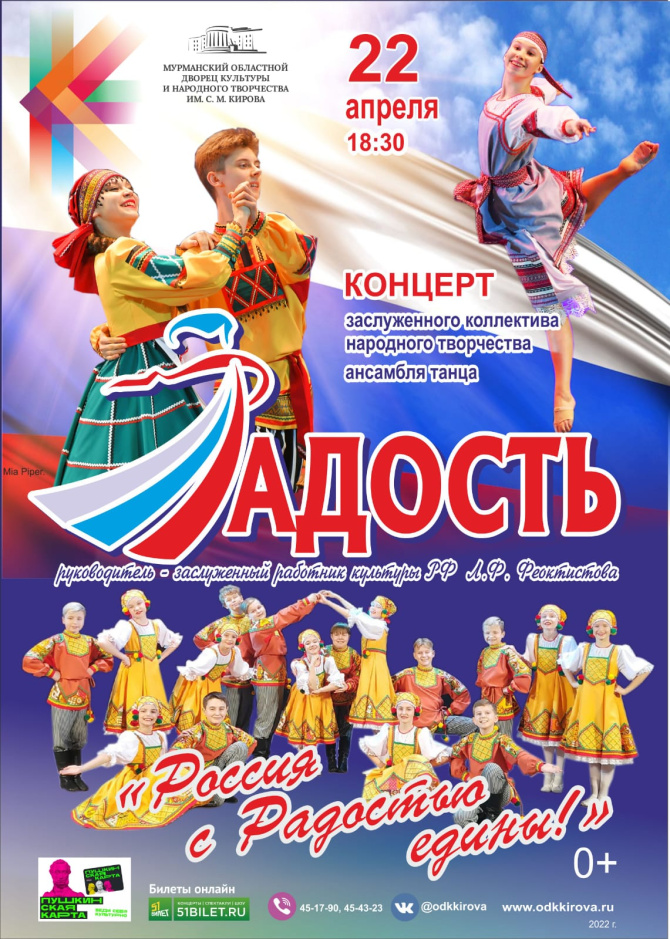 Всех любителей народного танца артисты приглашают на концертную программу «Россия с Радостью едины!» - увлекательное путешествие по многонациональной стране с юга на север. В этот вечер на сцену впервые выйдут и самые маленькие танцоры «Радости». Начало концерта в 18 часов 30 минут.