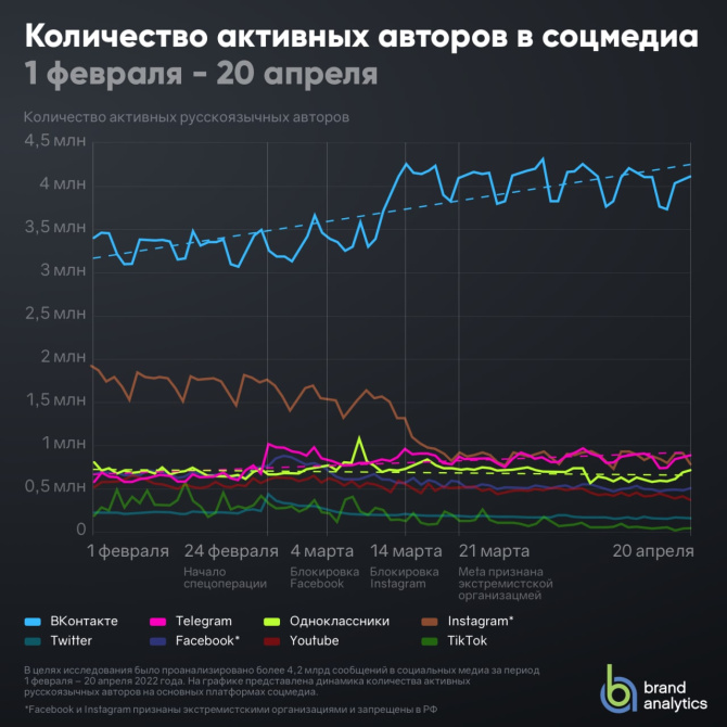 Блокировка соцсетей и ограничение заработка в них привело к росту социальной сети «ВКонтакте» на 22% по числу авторов и на 17% по объему контента. У мессенджера Telegram – плюс 24% по авторам и плюс 5% по контенту.