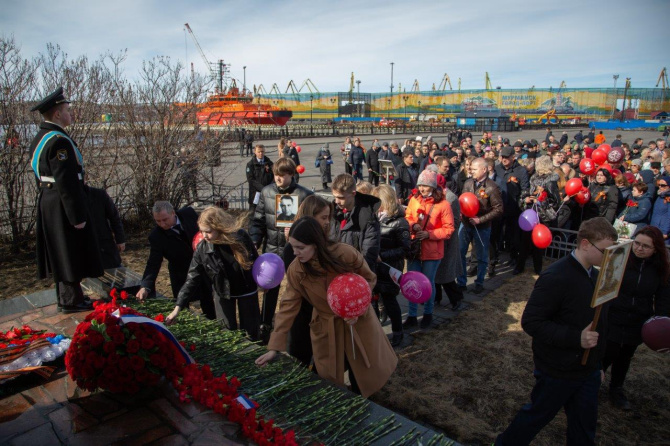 Сегодня в Мурманске состоялось традиционное шествие и возложение цветов к памятнику портовикам, погибшим в годы Великой Отечественной войны. В нем приняли участие представители АО «Мурманский морской торговый порт», Совета ветеранов АО «ММТП», Мурманского филиала ФГУП «Росморпорт», Администрации морских портов Западной Арктики, компании «МАСКО», ООО «Мурманский балкерный терминал», учащиеся транспортно-логистического класса гимназии № 8 г. Мурманска.
