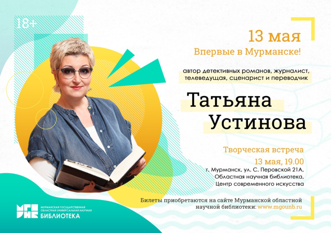 Российская писательница Татьяна Устинова прибыла в Кольское Заполярье с творческим визитом. Автор детективных романов, журналист, телеведущая, сценарист и переводчик на встрече с читателями расскажет о том, как рождается замысел произведения, как создаются характеры героев книг. Читатели узнают о творческих планах автора, о том, что она читает сама. Гости встречи смогут задать свои вопросы, а также получить автограф писателя.