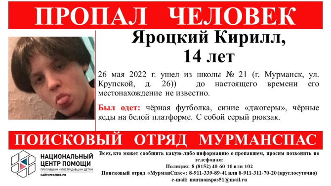 26 мая 14-летний Кирилл Яроцкий ушел из мурманской школы №21 и пропал. Об этом сообщили в поисковом отряде «МурманСпас».