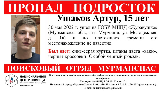 Пятнадцатилетний Артур Ушаков 30 мая 2022 года вышел из центра помощи детям "Журавушка" на улице Молодёжной в поселке Мурмаши, и до настоящего времени его местонохаждение неизвестно.