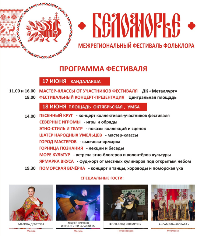 На юге Кольского полуострова пройдет самобытное культурное событие - Межрегиональный фестиваль фольклора «Беломорье». В этом году площадками фестиваля станут Кандалакша и Умба. 17 и 18 июня на Терский берег съедутся коллективы, народные мастера и блогеры из Республик Карелия и Коми, Ленинградской, Новгородской, Мурманской, Вологодской, Ярославской, Псковской, Архангельской областей, городов Санкт-Петербург и Москва. Участниками фестиваля станут представители 21 творческого коллектива и 58 мастеров – всего более 300 человек.