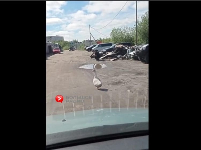 Объектив автомобильного видеорегистратора запечатлел пернатого гостя, который с невозмутимым спокойствием, не боясь людей и машин, следовал по своим гусиным делам.