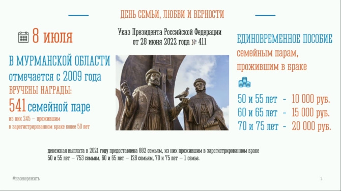 Ко Дню семьи, любви и верности в Мурманской области семейным парам вручат награды и денежные пособия.