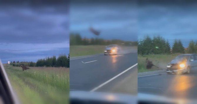 Напомним, что лось поскользнулся на асфальте при пересечении дороги. Далее машина столкнулась с животным, а то от силы удара подлетело вверх и рухнуло на обочину.