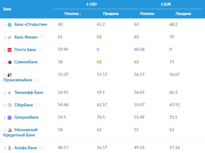 В Мурманске выгоднее всего купить и продать доллары можно в банке Финам, также, как и продать евро. А вот купить евро выгоднее в банке «Открытие».