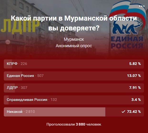 72.44% проголосовавших отметили, что не доверяют ни одной из партий. 13.06% отдали предпочтение «Единой России», 7.91% – ЛДПР.