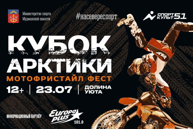 Кубок Арктики по мотофристайлу во второй раз пройдёт в заполярной столице. 23 июля в Долине Уюта мурманчане смогут увидеть затяжные прыжки на мотоцикле с высокого трамплина и акробатические трюки в исполнении лучших райдеров России.