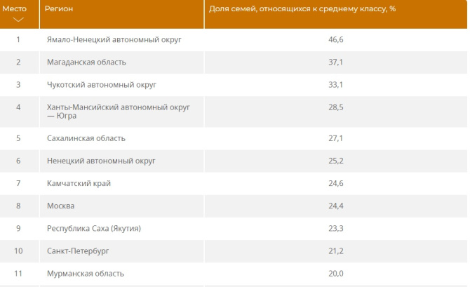 Согласно инфографике Ria.ru, в Мурманской области 20% семей относятся к среднему классу. Таким образом наш регион занимает 11 строчку рейтинга.