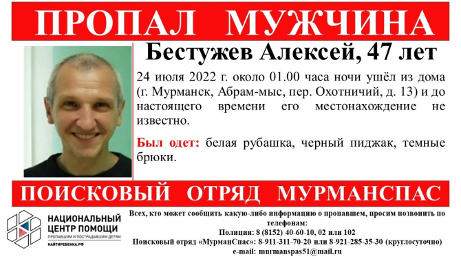 Как сообщается в группе поискового отряда «МурманСпас», 24 июля около 01:00 часа ночи мужчина вышел из дома №13 на пер. Охотничий в Абрам-Мысе. До настоящего момента его местонахождение неизвестно.