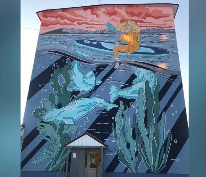 Участники из Мурманской области победили в номинации «Лучшее применение современных материалов и методик при создании монументальной живописи в Арктике». Мурал с белухами и девушкой SUP-сёрфером появился в Кандалакше. Автор идеи – Александр Трунковский, художник – Анастасия Андряшина.