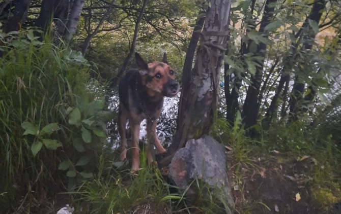 Накануне вечером в лесу мурманчане нашли привязанную к дереву собаку. Как дополнили очевидцы, животное было очень голодное, в стрессе, к себе подпустила не сразу.