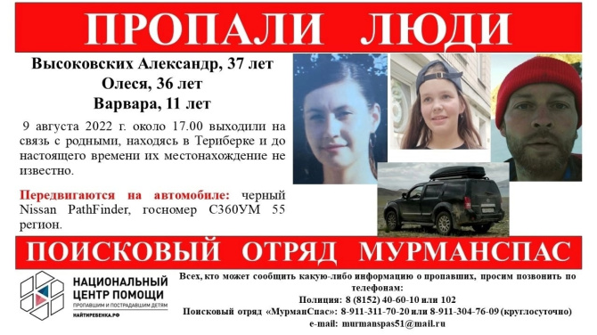 37-летний Александр Высоковский, его 36-летняя супруга Олеся и 11-летняя дочь Варвара последний раз выходили на связь с родными 9 августа – прислали фотографию с района Береговых орудий. С тех пор об их местонахождении ничего не известно, сообщили в группе «Моя Териберка».