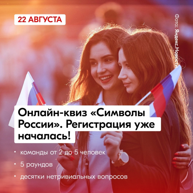 22 августа в 10:00 Роспатриотцентр проведет квиз-игру «Символы России», приуроченную ко Дню Государственного флага Российской Федерации.