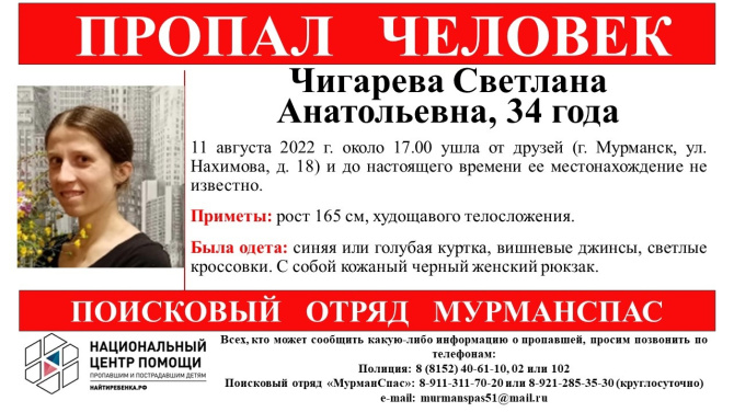 В Мурманске пропала 34-летняя Светлана Чигарева. 11 августа около 17:00 женщина ушла от друзей, проживающих по адресу: улица Нахимова, 18, и пропала.