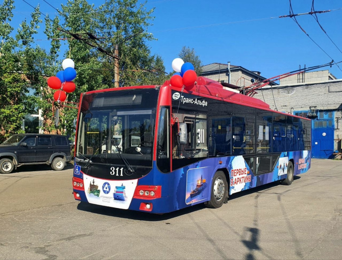 В честь 45-летия достижения атомным ледоколом «Арктика» Северного полюса в Мурманске на маршрут вышел специальный троллейбус с символикой ФГУП «Атомфлот». На бортах общественного транспорта размещены изображения легендарного атомохода и участников экспедиции, а также современные суда предприятия.