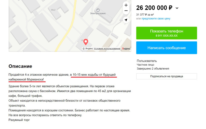 В Мурманске на улице Траловая, 6А продают здание за 26 200 000 рублей. в объявлении указано, что четырёхэтажный дом находится в 10-15 минутах ходьбы от «будущей набережной».