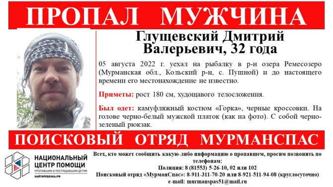 32-летний Дмитрий Глущевский 5 августа уехал на рыбалку в район озера Ремесозеро в Пушном. До настоящего времени его местонахождение неизвестно.
