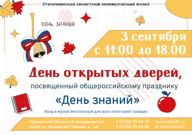 3 сентября с 11:00 до 18:00 в Мурманском областном краеведческом музее состоится День открытых дверей, посвященный Дню знаний.