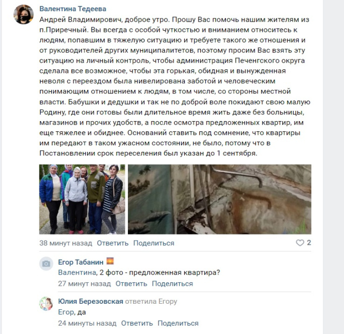 «Андрей Владимирович, Вы всегда с особой чуткостью и вниманием относитесь к людям, попавшим в тяжелую ситуацию и требуете такого же отношения и от руководителей других муниципалитетов, поэтому просим Вас взять эту ситуацию на личный контроль, чтобы администрация Печенгского округа сделала все возможное, чтобы эта горькая, обидная и вынужденная неволя с переездом была нивелирована заботой и человеческим понимающим отношением к людям, в том числе, со стороны местной власти. Бабушки и дедушки и так не по доброй воле покидают свою малую Родину, где они готовы были длительное время жить даже без больницы, магазинов и прочих удобств, а после осмотра предложенных квартир, им еще тяжелее и обиднее. Оснований ставить под сомнение, что квартиры им передают в таком ужасном состоянии, не было, потому что в Постановлении срок переселения был указан до 1 сентября», - поделилась Валентина Тедеева.