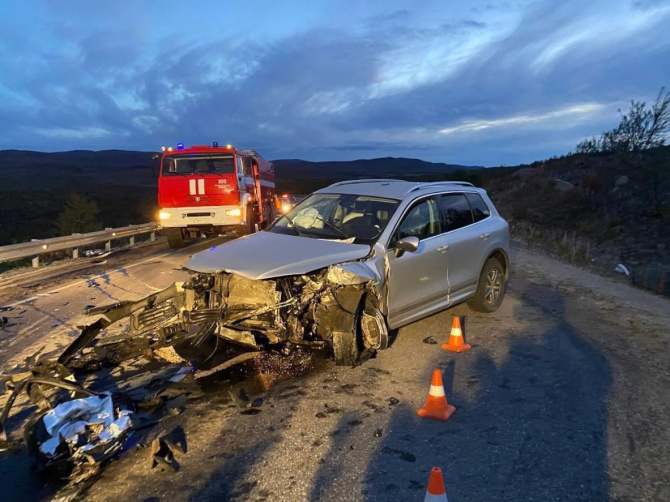 Накануне вечером в районе 13 км а/д Заполярный-Сальмиярви произошло ДТП. На дороге столкнулись легковые авто Volkswagen Touareg и Mitsubishi Lancer.