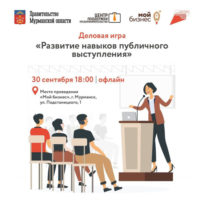 30 сентября в 18:00 в Центре «Мой бизнес» на Подстаницкого, 1 пройдёт деловая игра «Развитие навыков публичного выступления».