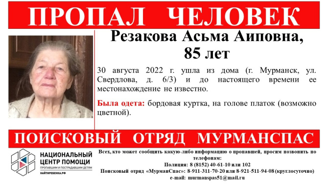 30 августа восьмидесятипятилетняя Асьма Аиповна Резакова вышла из дома №6/3 на улице Свердлова в Мурманске и пропала.