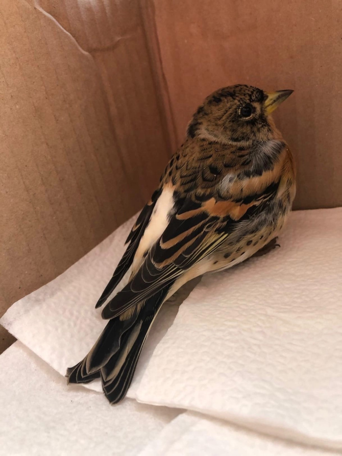 Вьюрок лечится и будет выпущен в природу. Но птичка оказалась не простой, а с «документами»! Окольцована металлическим орнитологическим кольцом Лондона!