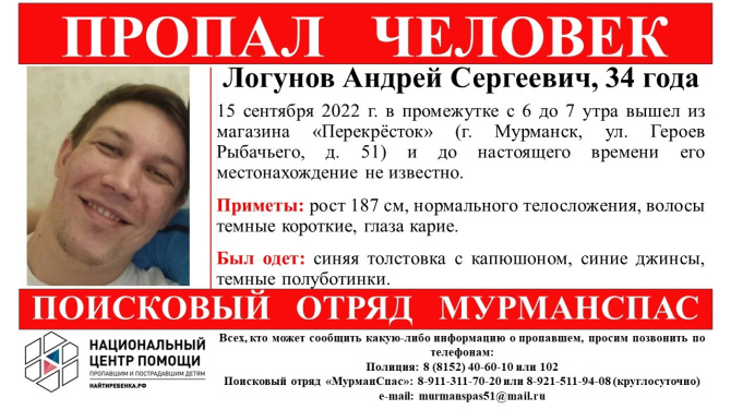 Андрей Сергеевич Логунов рано утром 15 сентября вышел из магазина "Перекрёсток" на улице Героев Рыбачьего в Мурманске, до настоящего момента его местонахождение неизвестно.