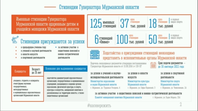 «По результатам конкурса планируется выделить 135 стипендий в размере 37 тысяч рублей. И шесть стипендий в размере 100 тысяч рублей», - отметил Егор Хаценко, председатель Комитета молодёжной политики Мурманской области.