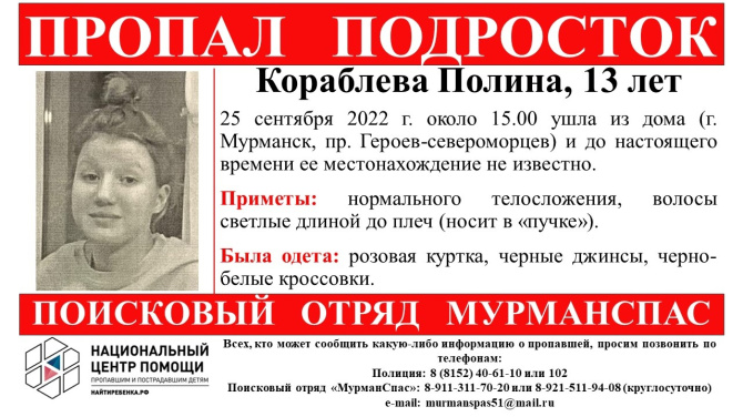 Тринадцатилетняя Полина Кораблёва 25 сентября 2022 года около 15 часов вышла из дома на проспекте Героев-Североморцев в Мурманске и до настоящего времени её местонахождение неизвестно.