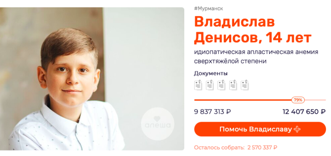 Благотворительный фонд помощи детям с тяжелыми заболеваниями «Алеша» занимается сбором средств в адрес Владислава Денисова.