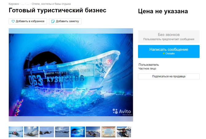 На популярном сайте бесплатных объявлений выставили на продажу экскурсионно-туристический центр «Снежная деревня», расположенный в Кировске.