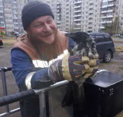 Поясняется, что птица застряла на опоре уличного освещения во дворе Кондрикова,…