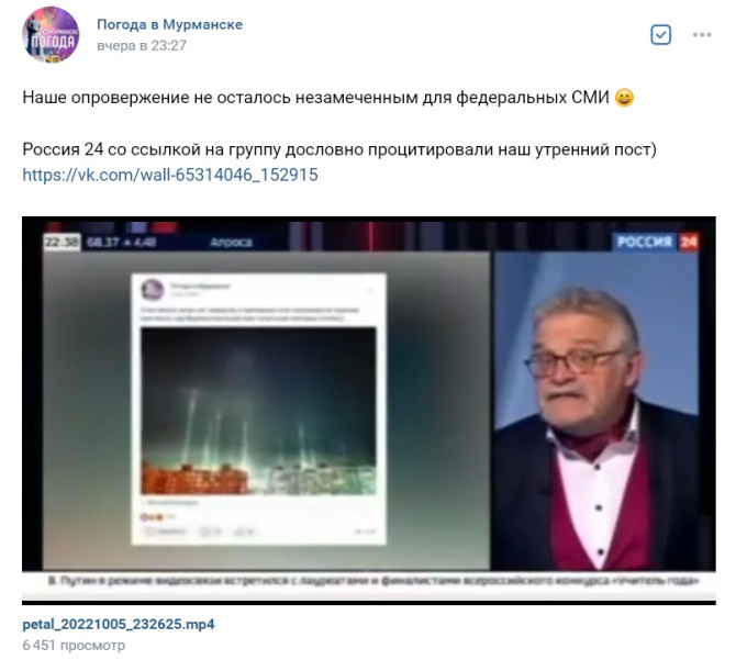 «Россия 24» со ссылкой на группу дословно процитировали наш утренний пост», - поделился мурманчанин.