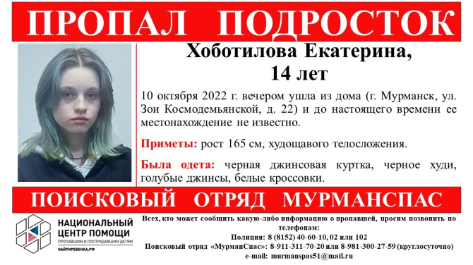 Если вы обладаете какой-либо информацией о местонахождении мурманчанки, сообщите ее по номерам, указанным в листовке.
