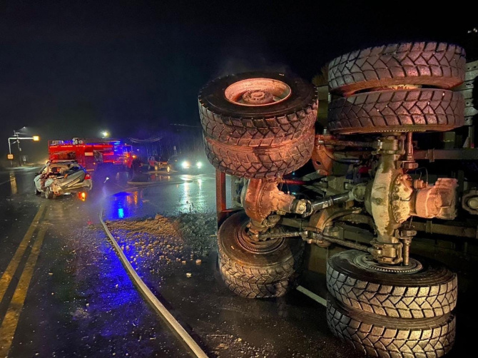 Накануне вечером на 13 км а/д Апатиты-Кировск столкнулись самосвал и Ford Focus. В результате ДТП грузовик перевернулся, произошёл розлив топлива.