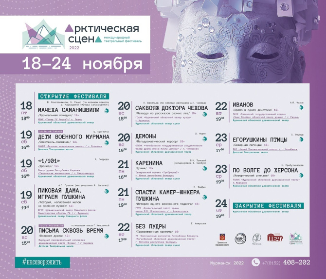 В Мурманске пройдёт второй этап Международного театрального фестиваля «Арктическая сцена». С 18 по 24 ноября мурманские зрители увидят постановки театров-участников из Минска и Могилёва (Беларусь), Перми, Петрозаводска, Челябинска, Рязани и Архангельска. Свои работы также представят Мурманский областной драматический театр, Мурманский областной театр кукол, Драматический театр Северного флота.