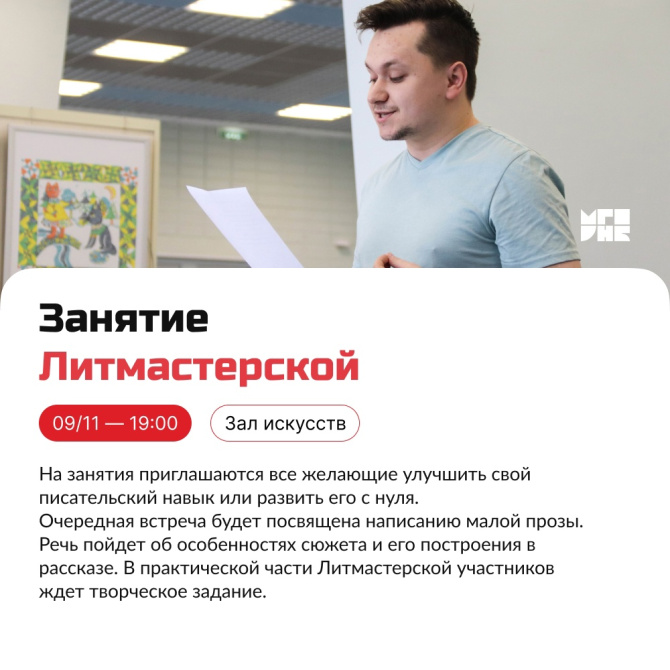 На занятие 9 ноября в 19:00 в зале искусств на 3 этаже приглашаются все желающие улучшить свой писательский навык или развить его с нуля. 16+