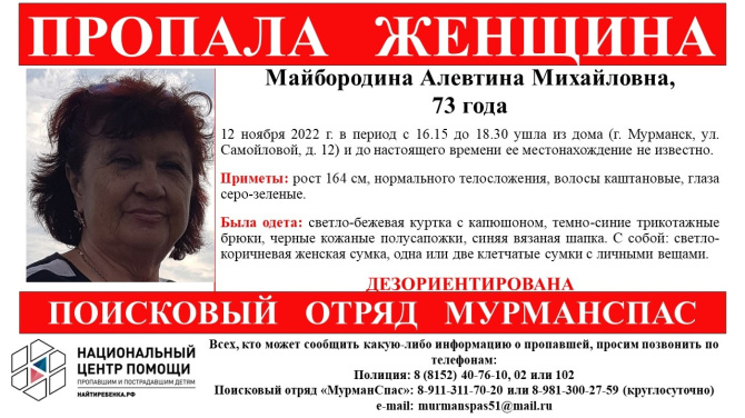 73-летняя Алевтина Майбородина ушла из дома на улице Самойловой, 12 в Мурманске в период с 16:50 до 18:30 12 ноября. До сих пор ее местонахождение неизвестно.