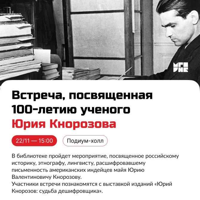 В мурманской областной научной библиотеке в рамках научно-социальной программы для молодежи и школьников «Шаг в будущее» состоится мероприятие, посвященное российскому историку, этнографу, лингвисту, расшифровавшему письменность американских индейцев майя, Юрию Кнорозову. Мероприятие состоится 22 ноября в 15 часов в подиум-холле на четвертом этаже.