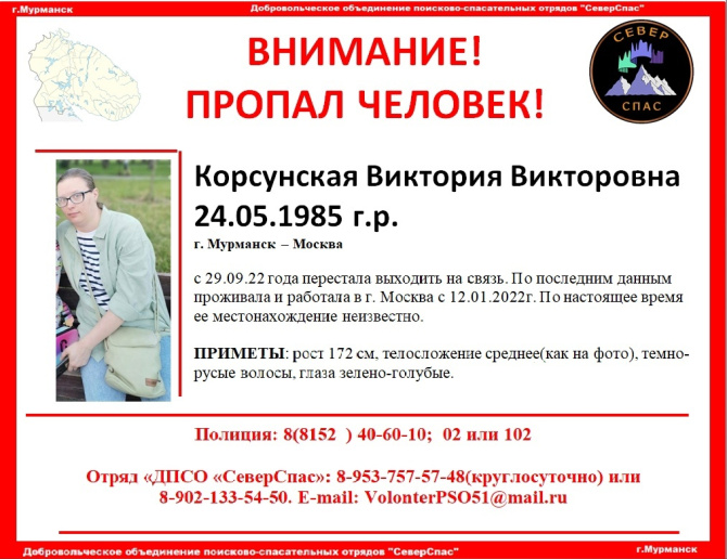 Пропала 37-летняя Виктория Корсунская. Мурманчанка перестала выходить на связь с 29 сентября.