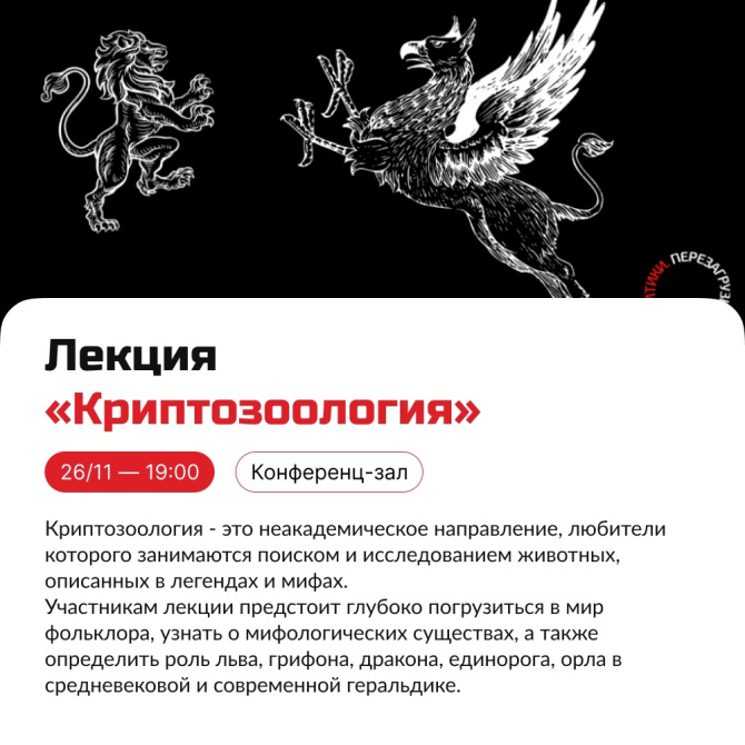 Участникам лекции предстоит глубоко погрузиться в мир фольклора, узнать о мифологических существах, их повадках, влиянии на культуру, религию, а также определить роль льва, грифона, дракона, единорога, орла в средневековой и современной геральдике.