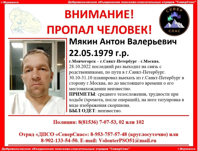 Пропал 43-летний житель Мончегорска Антон Мякин. Известно, что 28 октября мужчина последний раз выходил на связь с родственниками по пути в Санкт-Петербург. 30 октября он планировал выехать в сторону Москвы. До настоящего времени его местонахождение неизвестно.
