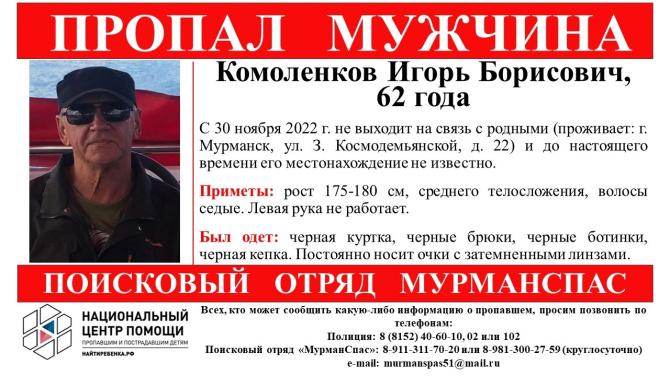 В Мурманске пропал 62-летний Игорь Комоленков. Мужчина не выходит на связь с 30 ноября. Проживает на улице Зои Космодемьянской, 22.