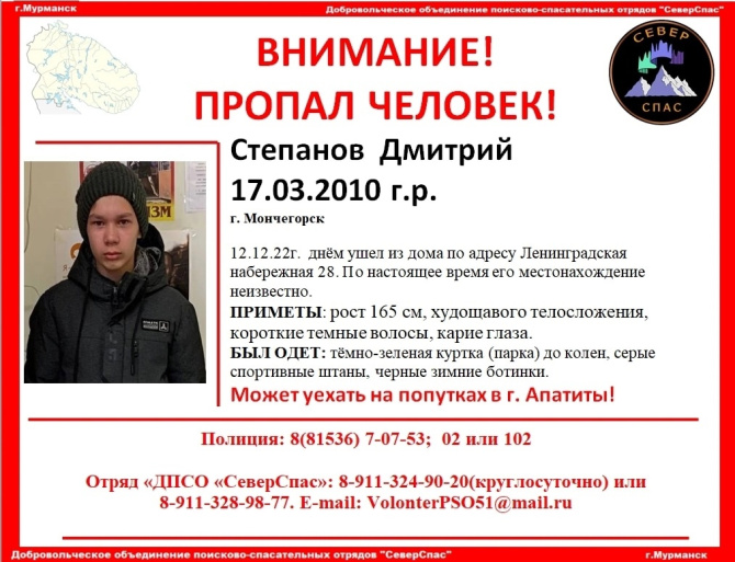 В Мончегорске пропал 12-летний Дмитрий Степанов. Подросток ушел из дома по адресу Ленинградская набережная, 29 днем 12 декабря. С тех пор его местонахождение неизвестно.